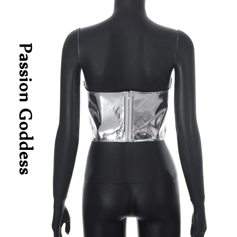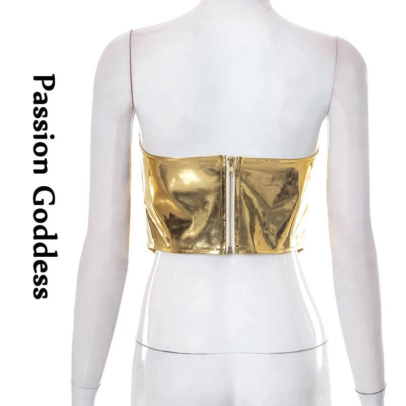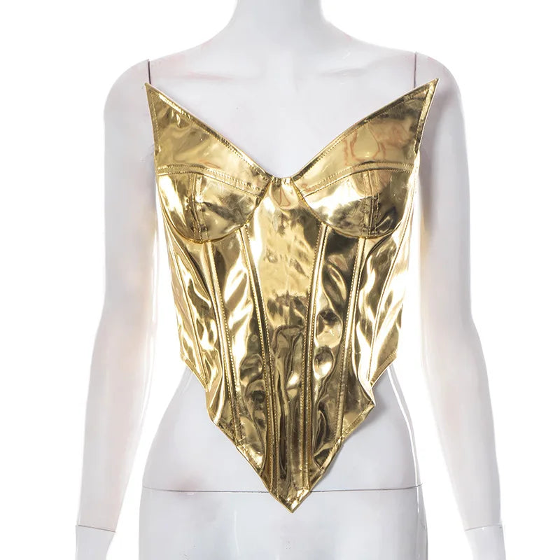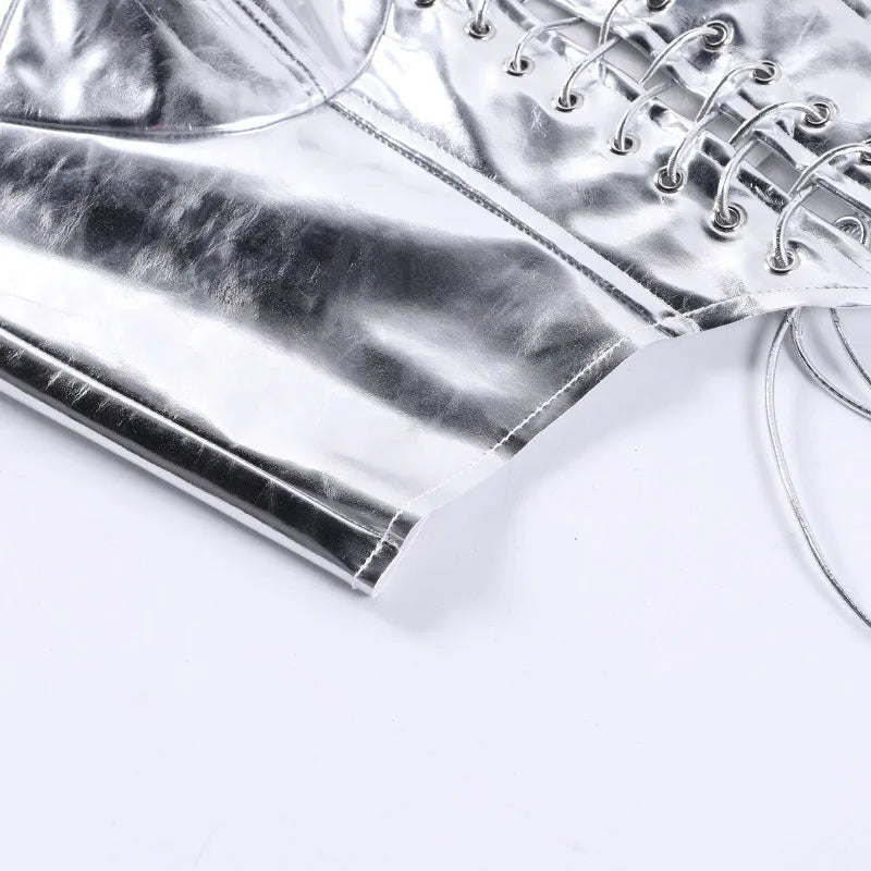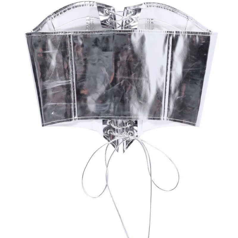 Sexy Frauen Shiny Gold Silber Bustier Crop Tops Helle PU Leder Krone Gürtel Abnehmen Taille Liebsten Low-cut Korsett top Sommer Festival Outfits | Techno Shirts | Rave Clothing