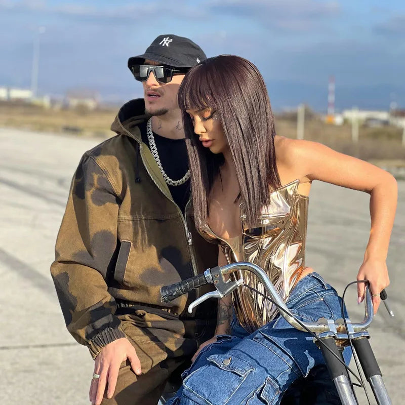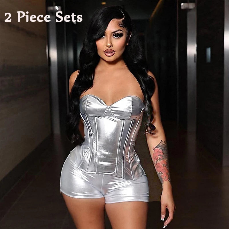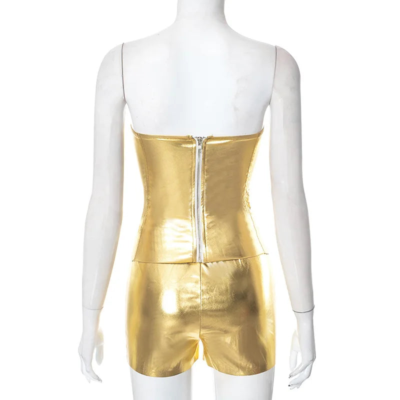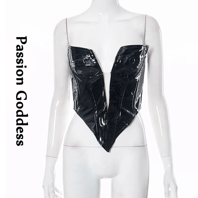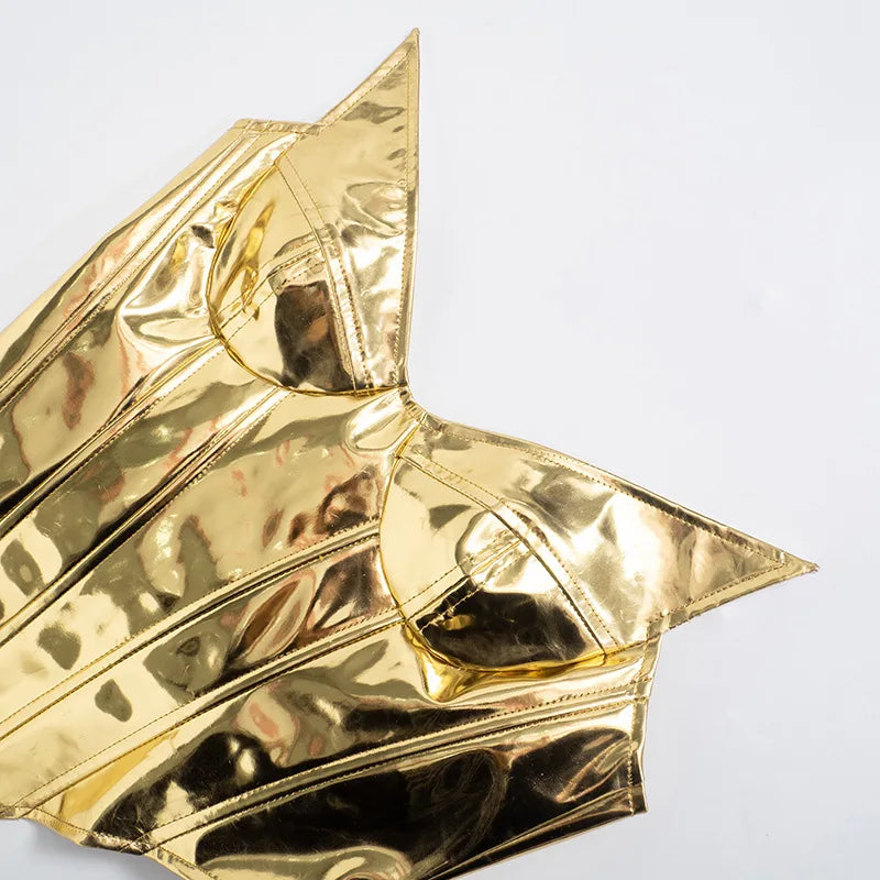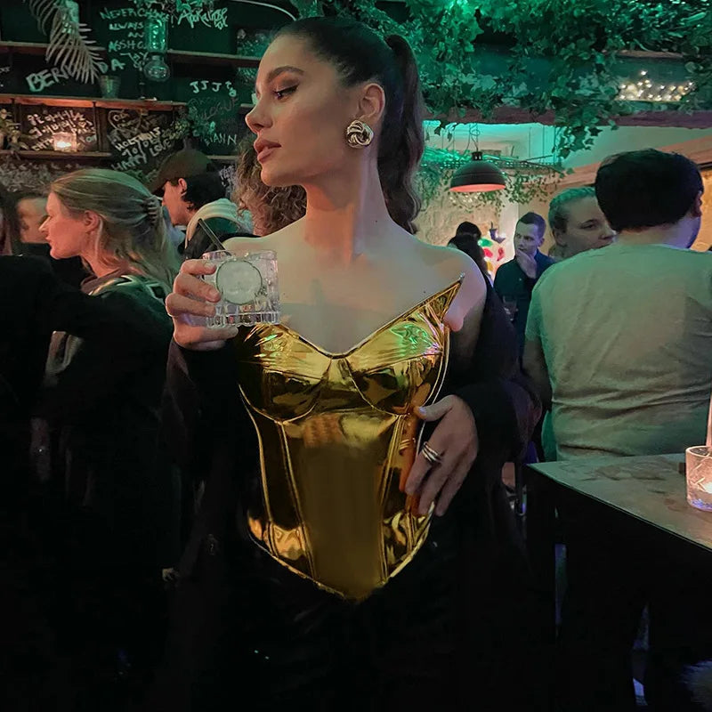 Sexy Frauen Shiny Gold Silber Bustier Crop Tops Helle PU Leder Krone Gürtel Abnehmen Taille Liebsten Low-cut Korsett top Sommer Festival Outfits | Techno Shirts | Rave Clothing