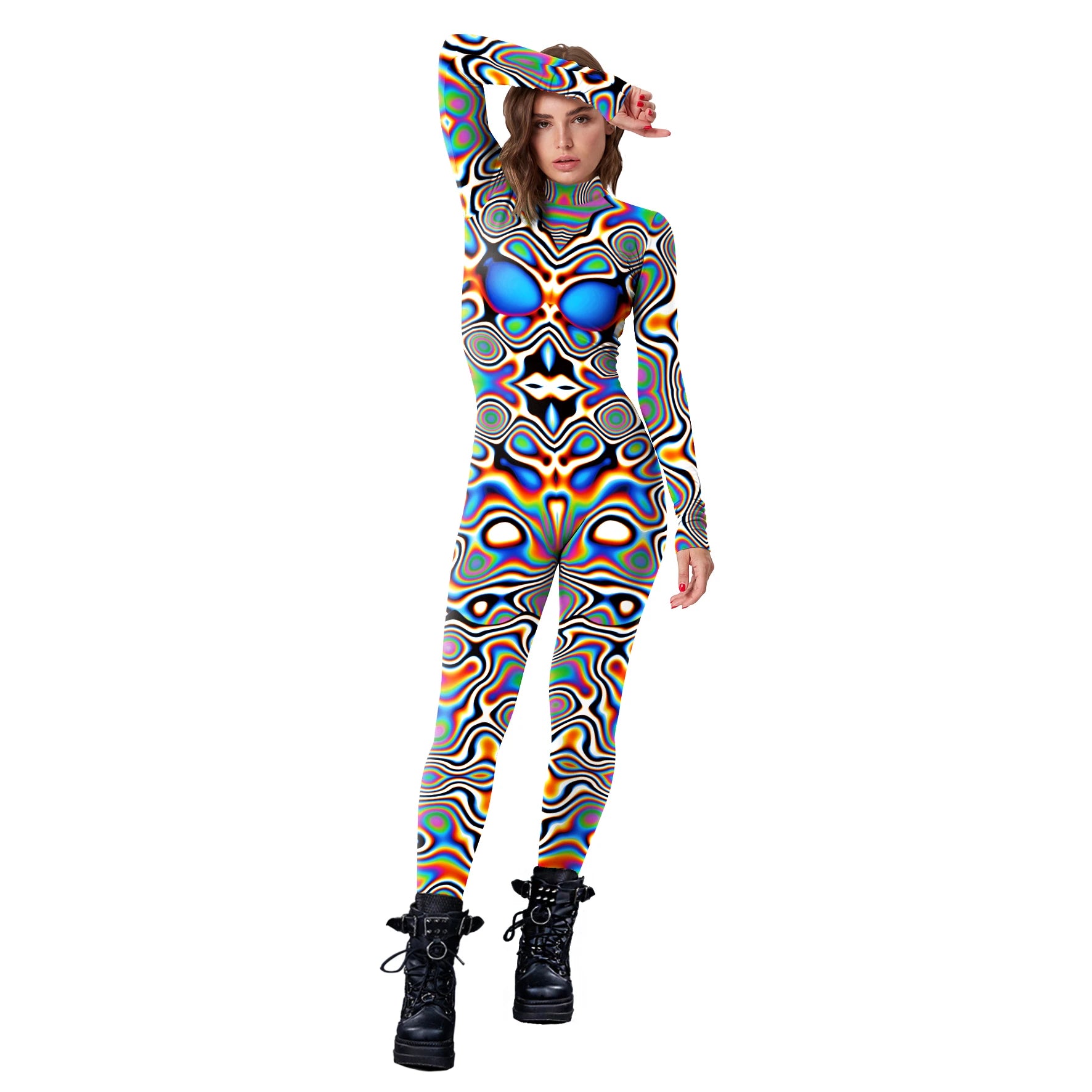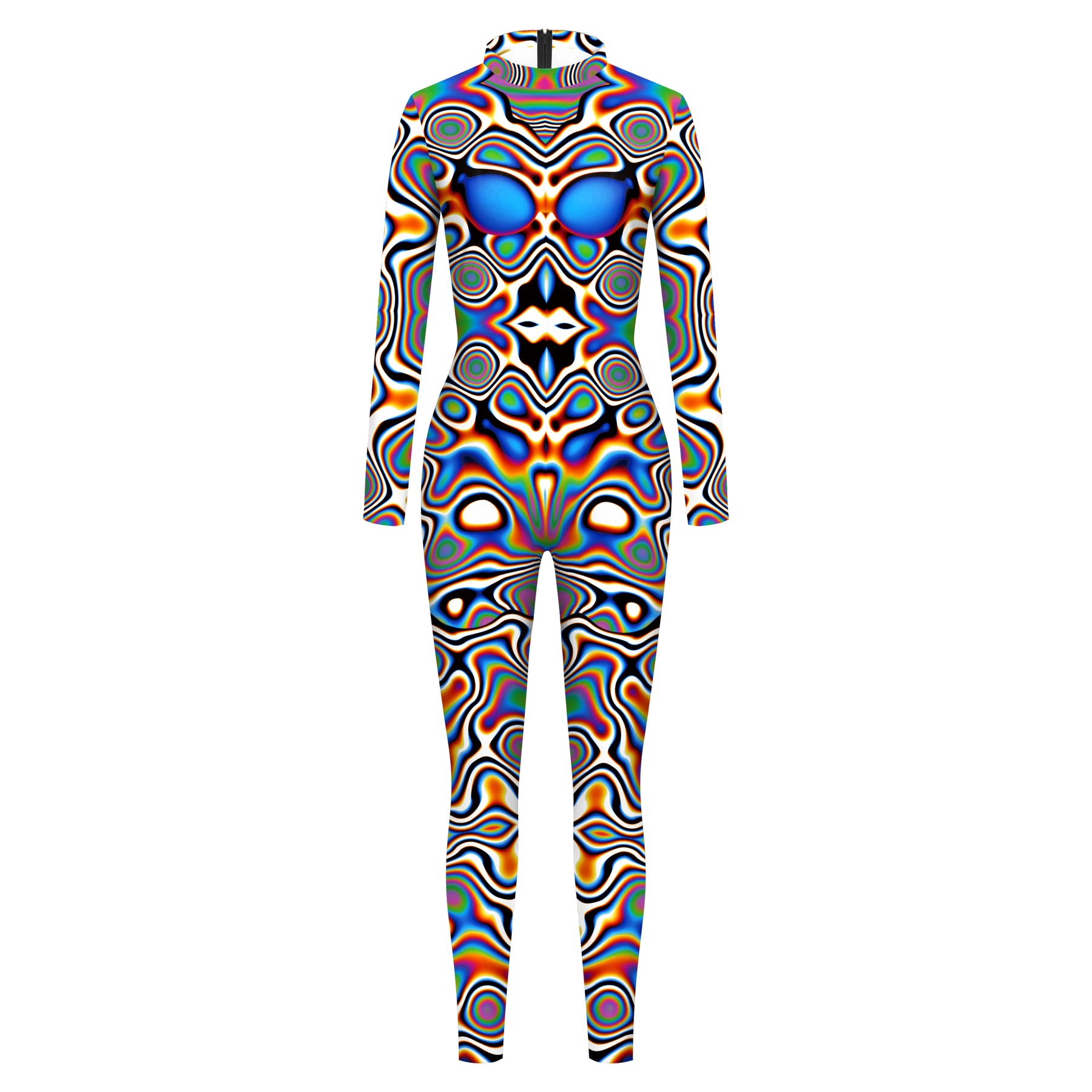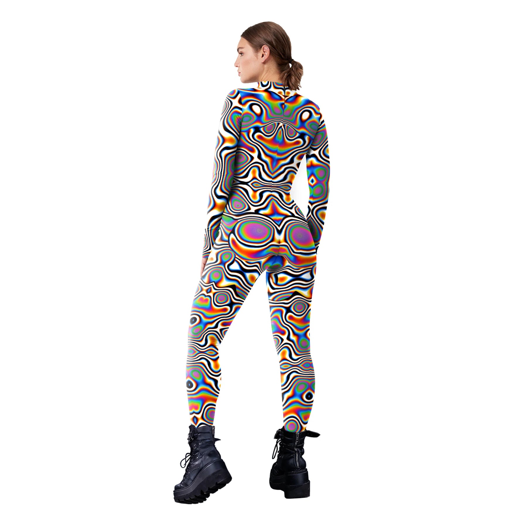 Das psychedelische Muster in leuchtenden, lebendigen Farben sorgt für ein auffälliges Aussehen, das sowohl auf der Tanzfläche als auch bei Tageslicht beeindruckt. Der hautenge, formschmeichelnde Schnitt bietet volle Bewegungsfreiheit, während das atmungsaktive Material für optimalen Komfort sorgt, selbst bei stundenlangem Tanzen.